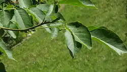 Statný opadavý listnáč s černošedou borkou, větve nejprve zelenohnědé, posléze šedé. Listy má lichozpeřené, 3–4 jařmé, složené zpravidla z 5–9 lístků. Lístky jsou relativně tuhé, tmavozelené, celokrajné, lysé, podlouhle vejčité a na konci špičaté. Stejně jako pupeny a vlastně všechny měkké části rostliny s výjimkou zralých jader ořechů mají charakteristickou ořešákovou vůni.