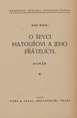 - ↑ a b LANTOVÁ, Ludmila. Medailon. In: STAŠEK, Antal. O ševci Matoušovi a jeho přátelích. Praha: Československý spisovatel, 1972, s. 3–9.