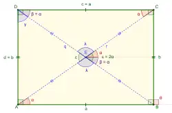 - Obdélníku lze opsat kružnici se středem v průsečíku úhlopříček a poloměrem rovným polovině délky úhlopříčky.
