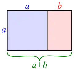 Platí-li pro délky stran obdélníku rovnost: , pak se nazývá zlatý obdélník. Poměr stran je 1:1,62 = 1,618033…, strany obdélníku odpovídají zlatým řezem rozdělené úsečce.[2]