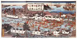 Sada tří ukiyo-e tisků – Ósacký přístav, autor: Jošitojo Gansuitei