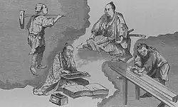 Vláda tokugawského šógunátu převzala koncem šestnáctého století koncepci myšlenkového proudu, který vycházel z čínského konfucianismu. Základem systému bylo dělení obyvatel podle povolání. Nejvýše postaveni byli ve společnosti samurajové, kteří většinou zastávali místa vládních úředníků, následovali rolníci, řemeslníci a obchodníci. Pouze málo obyvatel tehdejší doby stálo mimo tento společenský systém. Patřili k nim dvořané na císařském dvoře, lékaři, kněží, také někteří intelektuálové. Mimo společnost byli postaveni také osoby, vykonávající tzv. nečistá povolání (burakumin). Tento striktní systém společenských tříd byl zahrnut do oficiální vládní politiky a jeho udržování a posilování bylo prováděno klasifikací a sčítáním populace. Byl úspěšný dlouhou řadu let, až koncem vlády rodu Tokugawa začal selhávat.