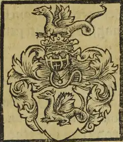 V modrém štítu je zelená nestvůra popisovaná jako drak, i když jde spíše o saň. Bývá vyobrazována se dvěma nebo se čtyřma nohama a nechrlí oheň. V klenotu je nestvůra ze štítu. Přikryvadla jsou modro-stříbrná.