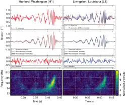 Pozorování gravitačních vln slibuje doplnění pozorování v elektromagnetickém spektru.[112] Očekává se, že poskytnou informace o černých dírách a jiných hustých objektech, jako jsou neutronové hvězdy a bílí trpaslíci, a o některých druzích kolapsů Supernov a o procesech ve velmi raném vesmíru, včetně charakteristických rysů určitých druhů hypotetických kosmických strun.[113] V únoru 2016 vědecký tým aLIGO oznámil, že detekoval gravitační vlny ze splynutí černých děr.[72][73][114]
