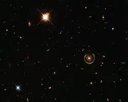Zakřivení paprsků světla gravitací je zodpovědné za novou třídu astronomických jevů. Pokud je mezi astronomem a vzdáleným cílovým objektem umístěn masivní objekt s vhodnou hmotností a vhodnou relativní vzdáleností, astronom uvidí několik deformovaných obrazů zdroje. Takové účinky jsou známé jako gravitační čočky.[101] V závislosti na konfiguraci, rozměrech a rozložení hmoty může vzniknout dva nebo více obrazů, jasný prsten známý jako Einsteinův prstýnek nebo částečné prstence nazvané oblouky.[102] První případ byl objeven v roce 1979;[103] od té doby byly pozorovány stovky gravitačních čoček.[104] Dokonce i když je více obrazů příliš blízko k sobě, aby bylo možné je vyřešit, efekt může být stále měřen, např. jako celkové zesvětlení cílového objektu; bylo zaznamenáno několik takových „událostí gravitačního mikročočkování“.[105]