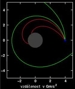 Tyto a související předpovědi vyplývají ze skutečnosti, že světlo sleduje dráhu tzv. světelné nebo nulové geodetiky – zobecnění přímek, kterými putuje světlo v klasické fyzice. Tyto geodetiky jsou zobecněním invariance rychlosti světla ve speciální teorii relativity.[64] Při zkoumání vhodných modelů prostoročasu (buď vnější Schwarzschildova metrika, nebo pro více než jedno těleso post-newtonovská aproximace)[65] se objevuje několik vlivů gravitace na šíření světla. I když ohyb světla může být také odvozen zobecněním volného pádu na světlo,[66] takto vypočtený úhel zakřivení je pouze poloviční oproti hodnotě dané obecnou teorií relativity.[67]