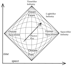 V obecné teorii relativity žádné hmotné těleso nedokáže dohonit nebo předstihnout světelný impuls. Žádný účinek události A nedosáhne jiné místo X před dopadem světla z A na X. V důsledku toho zkoumání všech světelných světočar (nulových geodetik) poskytuje klíčové informace o kauzální struktuře prostoročasu. Tato struktura může být zobrazena pomocí Penroseových diagramů, ve kterých jsou nekonečně velké oblasti prostoru a nekonečné časové intervaly zmenšeny („kompaktní“) tak, aby se vešly na konečnou mapu, zatímco světlo stále cestuje po diagonálách jako ve standardních prostoročasových schématech.[143]