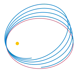 Podle obecné teorie relativity se apsidy jakékoliv oběžné dráhy (bod přiblížení nejbližšího tělesa obklopujícího centrum hmoty systému) stáčí. Oběžná dráha není čistě eliptická, podobá se spíše elipse otáčející se ve svém ohnisku, výsledná křivka má tvar podobný růžici (viz obrázek). Einstein nejprve odvodil tento výsledek použitím přibližné metriky představující newtonovskou hranici a využitím oběžného tělesa jako testovací částice. Skutečnost, že jeho teorie poskytovala jasné vysvětlení odchylky stáčení perihelia Merkuru, objevené v roce 1859 Urbainem Le Verrierem, byla pro Einsteina důležitým důkazem toho, že konečně našel správný tvar rovnic gravitačního pole.[80]