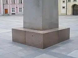 Monolit byl postaven na podložku z 5 mm silného olověného plechu na podstavci o základně 3 × 3 m a výšce 1,1 m (z nichž 20 cm je pod okolní dlažbou nádvoří).[25] Podstavec je sestaven ze čtyř stejně velkých hranolů[25] z leštěné liberecké žuly,[8][26] tedy narůžovělého hrubozrnného až velkozrnného biotitického granitu s velkými výrostlicemi růžového až světle červeného ortoklasu.[25] Pod podstavcem je vybetonován základ zvonovitého tvaru, který je dodnes přístupný chodbou ze sklepa blízkého Starého proboštství.[1] S podstavcem a betonovým základem pod ním je obelisk spojen 3,8 m dlouhým železným hranolem o profilu 60 × 60 cm.[25]