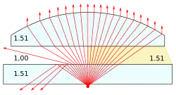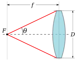 - θ je úhel okrajového paprsku (viz obrázek vpravo).