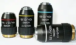 Numerické apertury objektivů se pohybují obvykle od 0,1 do 1,25 v závislosti na zvětšení. U imerzních objektivů je vedle apertury doplněno označení imerzního média, pro které je objektiv konstruován: olej (Oil, Oel), voda (Water, Wasser, WI), glycerin (Gly), homogenní (HI).[3]