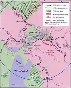 Bosenští Srbové zahájili ofenzivy, aby převzaly některá sousedství, zejména v Novom Sarajevu. Aby bylo vyváženo obléhání, 30. května 1992 Rada bezpečnosti požadovala, aby bylo do sarajevské bezpečnostní zóny zahrnuto sarajevské letiště,[87] která byla koncem června otevřena pro letecké přepravy OSN; přežití Sarajeva na nich silně záviselo. Ve srovnání s obléhacími silami byly bosenské vládní síly velmi špatně vyzbrojeny. Bosenští zločinci z černého trhu, kteří se připojili k armádě na začátku války, nelegálně pašovali zbraně do města přes srbské linie a nájezdy na Srby držené pozice ve městě přinesly více.