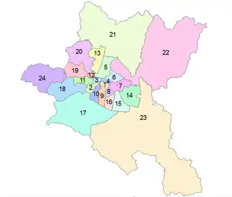 Rajón 1 Sredec (Средец) 2 Krasno Selo (Красно село) 3 Văzraždane (Възраждане) 4 Oborište (Оборище) 5 Serdika (Сердика) 6 Podujane (Подуяне) 7 Slatina (Слатина) 8 Izgrev (Изгрев) 9 Lozenec (Лозенец) 10 Triadica (Триадица) 11 Krasna Poljana (Красна поляна) 12 Ilinden (Илинден) 13 Nadežda (Надежда) 14 Iskăr[p 1] (Искър) 15 Mladost (Младост) 16 Studentski (Студентски) 17 Vitoša[p 2] (Витоша) 18 Ovča Kupel[p 3] (Овча купел) 19 Ljulin (Люлин) 20 Vrăbnica[p 4] (Връбница) 21 Novi Iskăr[p 5] (Нови Искър) 22 Kremikovci[p 6] (Кремиковци) 23 Pančarevo[p 7] (Панчарево) 24 Bankja[p 8] (Банкя) |