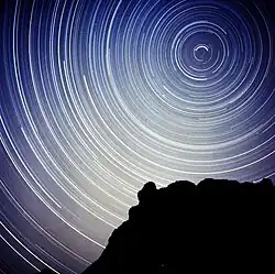 Astrofotografie Polárky s cirkumpolárními hvězdami pořízená velmi dlouhým časem několika hodin. Hvězdy poblíž nebeského pólu zanechávají kratší stopu.
