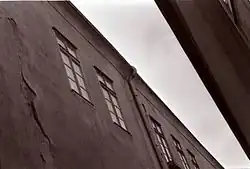 Rozdělení obrazu na tři plány - stroj, věž a pozadí. Bývalý uhelný důl Bois du Cazier v belgickém Marcinelle