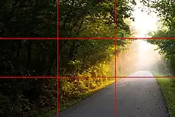 Pravidlo třetin je základním pravidlem ve výtvarném umění. Cílem je umístit předměty a oblasti zájmu do blízkosti jedné z linií tak, aby byl obraz rozdělen na tři stejné části. Dalším cílem je umístit objekty do průsečíků třetinových linií.