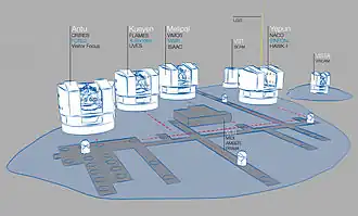 Hlavní dalekohledy o průměru 8,2 m jsou umístěny v kompaktních, tepelně řízených budovách, které se otáčejí synchronně s dalekohledy. Tak jsou minimalizovány jakékoliv nepříznivé účinky na činnost zařízení. Původní názvy těchto velkých dalekohledů UT1 až UT4 byly změněny na Antu (Slunce), Kueyen (Měsíc), Melipal (Jižní kříž) a Jepun (Večernice) v jazyce mapuche, řeči místního indiánského národa.
