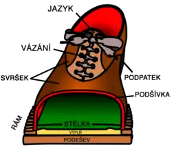 - venkovní boty a městské a domácí střevíce s pevným rámem a stélkou (branzol), na niž je svrchu našit či přilepen svršek s jazykem, svazovaný tkaničkami. Na spodní straně bývá vpředu podešev a vzadu podpatek.