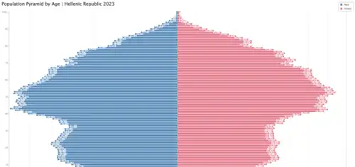 Řecko stejně jako mnoho jiných evropských států vykazuje stárnutí populace. Podle sčítání v roce 1961 bylo 10,9 % celkové populace starších než 65 let; jejich počet vzrostl na 19 % v roce 2011. Naopak procento populace populace ve věku 0-14 let klesl mezi lety 1961 a 2011 o 10,2 %. V roce 2022 se v Řecku narodilo vůbec nejméně dětí za téměř 100 let.[2]