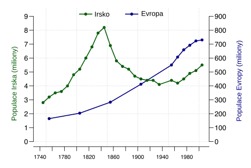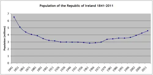 Irsko mělo v průběhu historie malou populaci. V osmnáctém století a na počátku 19. století Irsko zažilo, stejně jako celá Evropa, populační rozmach jako důsledek zemědělské a průmyslové revoluce. To ale dramaticky změnil Velký irský hladomor v polovině 19. století, který zapříčinil i masovou emigraci. Tento hladomor byl nejdramatičtější událostí irských demografických dějin. Podle sčítání v roce 1841 žilo ve čtyřech provinciích Connacht, Leinster, Munster a Ulster 6 528 799 lidí. Podle sčítání v roce 1881 klesla populace Irska o zhruba 2,6 milionu lidí (41 % obyvatel z roku 1841) a v Irsku zůstalo 3 870 020 lidí. V následujícím století populace Irska nadále pomalu klesala, historické minimum bylo 2 971 992 lidí v roce 1926 (po občanské válce). Následkem toho má Irsko menší populaci než jiné evropské země podobné velikosti.[2]