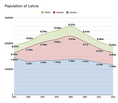 Po II. světové válce v zemi zůstalo jen málo Židů a Němců a následkem masivní imigrace Rusů, Ukrajinců a Bělorusů se Lotyši téměř stali minoritou. V roce 1989 klesl podíl Lotyšů na populaci na jen 52 % (v roce 1935 to bylo 75,5 %). I přes klesající počet Lotyšů kvůli nízké porodnosti se v následujících dvou desetiletím jejich podíl na celkové populaci zvýšil na 62,1 % v roce 2011 (mírně vyšší číslo než 62,0 % v roce 1959). Bylo to dáno vysokou mírou emigrace Rusů, Ukrajinců a Bělorusů. Těch mezi lety 1989 a 2011 ubylo téměř o polovinu.
