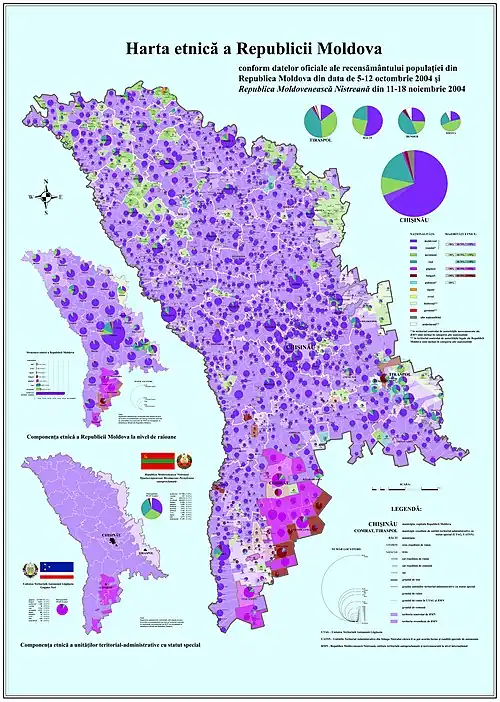 Moldavané jsou největší etnickou skupinou v zemi. Podle zkombinovaných dat sčítání v oblasti kontrolované vládou a v Podněstří tvořili 69,6 % populace. Poměr Ukrajinců a Rusů v populaci se významně snížil oproti sčítán v roce 1989: z 13,8 % na 11,2 % a z 13,0 % na 9,4 %. Důvodem je hlavně emigrace. Ukrajinci žijí hlavně na východě Podněstří a na severu, zatímco Rusové hlavně ve městech: 27 % všech Rusů žije v Kišiněvu, 18 % v Tiraspolu, 11 % ve městě Tighina a 6 % v Bălţi. Gagauzové jsou čtvrtou největší etnickou skupinou (3,8 % v roce 2004). Většina z nich žije na jihu Moldavska v autonomní oblasti Gagauzsko.