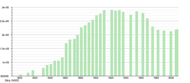 Kolem roku 1800 měla Paříž asi 500 000 obyvatel. Během 19. století populace města výrazně vzrůstala s přílivem lidí ze všech regionů Francie, především z venkovských oblastí. Ve 40. letech přesáhl počet obyvatel milión (kolem roku 1846). Připojením okolních obcí v roce 1860 vzostl počet o dalších více než 500 000. Růst pokračoval bez přerušení až do počátku 20. století. Při sčítání lidu roku 1891 se ukázalo, že došlo k poklesu populace ve čtyřech centrálních obvodech (1., 2., 3. a 4.), dále v 10. a 11. obvodu a stagnaci v 5. a 6. obvodu. Vzrůst probíhal pouze v 7. a 8. obvodu a v okrajových obvodech. Před první světovou válkou měla Paříž téměř 2,9 milionu obyvatel, čímž dosáhla historického vrcholu.