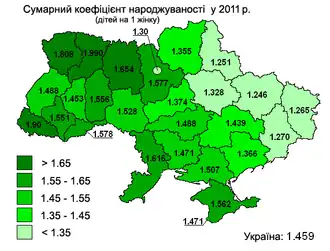 Míra porodnosti na Ukrajině je nízká.[4][5] Existují však značné rozdíly na regionální úrovni. Ve třetím čtvrtletí 2007 například nejvyšší porodnost vykazovala Volyňská oblast s mírou porodnosti 13,4/1 000 obyvatel, zatímco celková ukrajinská míra byla 9,6/1 000 obyvatel.[6]