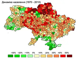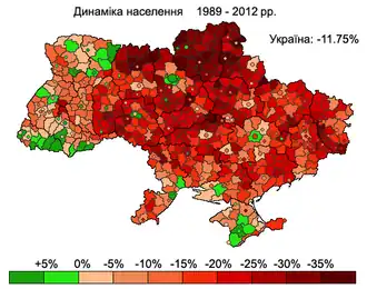 Mezi sčítáním v roce 1989 a sčítáním v roce 2001 se populace Ukrajiny snížila z počtu 51 706 600 lidí na 48 457 020,[3] země tedy přišla o 2 926 700 lidí, tedy o 5,7 % populace z roku 1989. Tento trend byl ovšem nerovnoměrný. Rovenská oblast a Zakarpatská oblast zažily mírné zvýšení počtu obyvatel (+3 %, respektive 5 %) Volyňská oblast (také západ Ukrajiny), přišla mezi lety 1989 a 2001 jen o 1 % obyvatel.[3] Hlavní město Kyjev zvýšilo svou populaci o 3 %.[3]