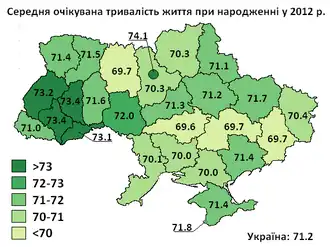 S výjimkou kyjevského regionu byly všechny regiony s více narozeními než úmrtími v méně průmyslově rozvinutých regionech západní Ukrajiny. Poměr mezi narozeními a úmrtími se z poměru 1 ku 1,7 v letech 2004-2005 zlepšil na 1 ku 1,4 v roce 2008. Nejhorší poměr narozených a zemřelých byl ve východních a centrálních oblastech Doněck, Luhansk, Čerkasy a Poltava. V těchto regionech bylo 2,1 úmrtí na jedno narození.[7]
