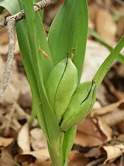 Plodem je tobolka, která je po přezimování pod zemí vynesena silnou lodyhou nad zem, kde dozrává.