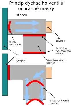 Výdechový jednocestný ventil slouží pro odvod vydechnutého vzduchu mimo lícnici masky a zároveň musí splňovat vysoké nároky proti podsávání při nádechu, kdy jím nesmí do lícnice pronikat zamořený vzduch. Obvykle je tvořen dvěma i více pružnými gumovými membránami.