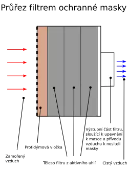 Ochranný filtr - Ochranný filtr obvykle obsahuje protidýmovou vložku a náplň z aktivního uhlí, popřípadě dalších chemikálií, podle zaměření na určitý druh škodliviny u filtrů průmyslových. Protidýmová vložka zachycuje větší pevné částice (prach) a kapičky aerosolů a je vždy umístěna před vložkou tvořenou aktivním uhlím. Jejím účelem je zabránit rychlému zanesení jemných pórů aktivního uhlí prachem nebo kapalinou, což by velmi zvýšilo sílu potřebnou pro dýchání a dýchání by posléze až znemožnilo. Samotné aktivní uhlí také tyto částice nezachycuje dostatečně efektivně.
