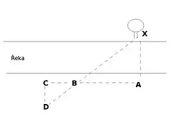 Stoupneme si na břeh naproti nějakému orientačnímu bodu, např. stromu. Označme si pro přehlednost místo, kde stojíme A (viz obrázek), strom X. Z bodu A běž 60 m podél břehu řeky do bodu B, kde zarazíme do země skautskou hůl. Dále pokračujeme dalších 30 m do bodu C. I místo C si raději něčím označíme (postačí kámen). V bodě C vlevo v bok (tedy obrat o 90 stupňů od původní trasy) a nyní hledáme bod D. Bod D leží na spojnici bodu B a X. Vzdálenost mezi bodem D a C je polovinou vzdálenosti z bodu A do bodu X – šířky řeky.