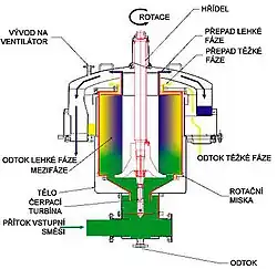 - Usazovací komory, ve které jsou kapalné fáze důkladně separovány odstředivou silou. Přepadová hradítka stabilizují separační rozhraní nezávisle na průtocích. Poloha mezifáze závisí na průměru přepadového hradítka těžké fáze, které je vyměnitelné a volitelné podle rozdílů hustot jednotlivých fází.