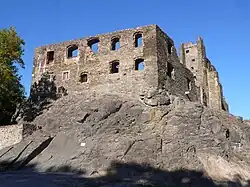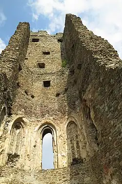 Ve třináctém století byla jádrem hradu polygonální věž postavená na nejvyšším místě skály. V jejím přízemí se nacházela náročně provedená kaple. Většina opevnění tvořeného hradbou zanikla při úpravách ve čtrnáctém století. Fragmenty zdi se dochovaly na jižní a východní straně velké věže, kde později plnily funkci parkánové hradby.[2]
