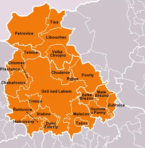 Dolní Zálezly • Habrovany • Homole u Panny (Babiny II • Bláhov • Byňov • Doubravice • Haslice • Lhota pod Pannou • Nová Ves u Pláně • Suletice) • Chabařovice (Roudníky) • Chlumec (Český Újezd • Hrbovice • Chlumec • Stradov • Střížovice • Žandov) • Chuderov (Chuderovec • Libov • Lipová • Radešín • Žežice) • Libouchec (Čermná • Knínice • Žďárek) • Malé Březno (Leština) • Malečov (Babiny I • Březí • Čeřeniště • Horní Zálezly • Němčí • Pohoří • Proboštov • Rýdeč • Řetouň) • Petrovice (Krásný Les) • Povrly (Mírkov • Neštědice • Roztoky • Slavošov) • Přestanov • Ryjice • Řehlovice (Brozánky • Dubice • Habří • Hliňany • Moravany • Radejčín • Stadice) • Stebno (Chvalov • Milbohov • Podlešín • Suchá) • Tašov • Telnice (Liboňov • Varvažov) • Tisá • Trmice (Koštov • Újezd) • Ústí nad Labem (Ústí nad Labem-centrum • Božtěšice • Brná • Bukov • Církvice • Habrovice • Hostovice • Klíše • Kojetice • Krásné Březno • Mojžíř • Neštěmice • Olešnice • Předlice • Sebuzín • Severní Terasa • Skorotice • Strážky • Střekov • Svádov • Vaňov • Všebořice) • Velké Březno (Valtířov) • Velké Chvojno (Arnultovice • Luční Chvojno • Malé Chvojno • Mnichov • Žďár) • Zubrnice (Týniště)