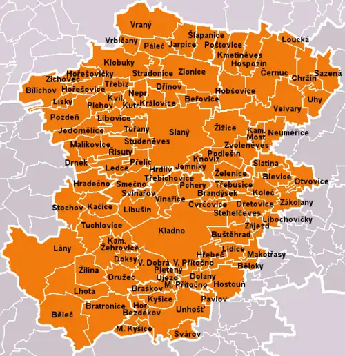 Běleč • Běloky • Beřovice (Bakov) • Bílichov • Blevice • Brandýsek (Olšany) • Braškov • Bratronice (Dolní Bezděkov) • Buštěhrad • Cvrčovice • Černuc (Bratkovice • Miletice • Nabdín) • Doksy • Dolany • Drnek • Družec • Dřetovice • Dřínov (Drchkov) • Hobšovice (Skůry) • Horní Bezděkov • Hořešovice • Hořešovičky • Hospozín (Hospozínek) • Hostouň • Hradečno (Nová Studnice • Nová Ves) • Hrdlív • Hřebeč (Netřeby) • Chržín (Budihostice • Dolní Kamenice) • Jarpice (Budenice) • Jedomělice • Jemníky • Kačice • Kamenné Žehrovice • Kamenný Most • Kladno (Dubí • Kročehlavy • Rozdělov • Švermov • Vrapice) • Klobuky (Čeradice • Kobylníky • Kokovice • Páleček) • Kmetiněves • Knovíz • Koleč (Mozolín • Týnec) • Královice • Kutrovice • Kvílice • Kyšice • Lány (Vašírov) • Ledce • Lhota • Libochovičky • Libovice • Libušín • Lidice • Líský • Loucká • Makotřasy • Malé Kyšice • Malé Přítočno • Malíkovice (Čanovice • Hvězda) • Neprobylice • Neuměřice • Otvovice • Páleč • Pavlov • Pchery (Humny) • Pletený Újezd • Plchov • Podlešín • Poštovice • Pozdeň (Hřešice) • Přelíc • Řisuty • Sazená • Slaný (Blahotice • Dolín • Kvíc • Kvíček • Lotouš • Netovice • Otruby • Slaný • Trpoměchy • Želevčice) • Slatina • Smečno • Stehelčeves • Stochov (Čelechovice • Honice) • Stradonice • Studeněves • Svárov • Svinařov • Šlapanice (Budeničky) • Třebichovice (Saky) • Třebíz • Třebusice (Holousy) • Tuchlovice (Srby) • Tuřany (Byseň) • Uhy • Unhošť • Velká Dobrá • Velké Přítočno • Velvary (Ješín • Malá Bučina • Velká Bučina) • Vinařice • Vraný (Horní Kamenice • Lukov) • Vrbičany • Zájezd (Bůhzdař) • Zákolany (Kováry • Trněný Újezd) • Zichovec • Zlonice (Břešťany • Lisovice • Tmáň • Vyšínek) • Zvoleněves • Želenice • Žilina • Žižice (Drnov • Luníkov • Osluchov • Vítov)