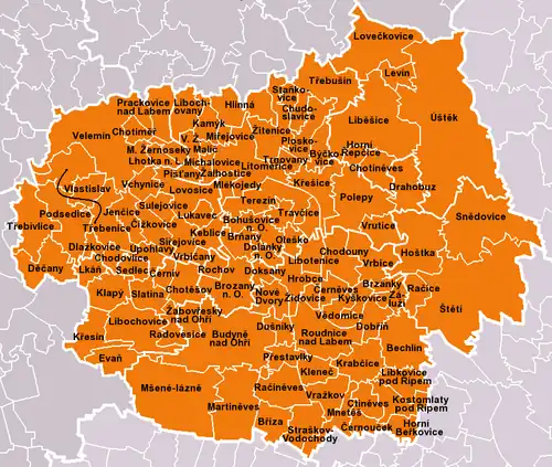 Bechlín (Předonín) • Bohušovice nad Ohří (Hrdly) • Brňany • Brozany nad Ohří (Hostěnice) • Brzánky • Bříza • Budyně nad Ohří (Břežany nad Ohří • Kostelec nad Ohří • Nížebohy • Písty • Roudníček • Vrbka) • Býčkovice (Velký Újezd) • Ctiněves • Černěves • Černiv • Černouček • Čížkovice (Želechovice) • Děčany (Lukohořany • Semeč • Solany) • Dlažkovice • Dobříň • Doksany • Dolánky nad Ohří • Drahobuz (Břehoryje • Strážiště) • Dušníky • Evaň (Horka) • Hlinná (Kundratice • Lbín • Tlučeň) • Horní Beřkovice • Horní Řepčice • Hoštka (Kochovice • Malešov • Velešice) • Hrobce (Rohatce) • Chodouny (Lounky) • Chodovlice • Chotěšov • Chotiměř • Chotiněves (Jištěrpy) • Chudoslavice (Myštice) • Jenčice • Kamýk • Keblice • Klapý • Kleneč • Kostomlaty pod Řípem • Krabčice (Rovné • Vesce) • Křesín (Levousy) • Křešice (Nučnice • Sedlec • Třeboutice • Zahořany) • Kyškovice • Levín (Horní Vysoké) • Lhotka nad Labem • Liběšice (Dolní Chobolice • Dolní Nezly • Dolní Řepčice • Horní Chobolice • Horní Nezly • Jeleč • Klokoč • Lhotsko • Mladé • Nová Vesnička • Soběnice • Srdov • Trnobrany • Zimoř) • Libkovice pod Řípem • Libochovany (Řepnice) • Libochovice (Dubany • Poplze) • Libotenice • Litoměřice (Město • Pokratice • Předměstí • Za nemocnicí) • Lkáň • Lovečkovice (Dolní Šebířov • Hlupice • Knínice • Levínské Petrovice • Mukařov • Náčkovice • Touchořiny) • Lovosice • Lukavec • Malé Žernoseky • Malíč • Martiněves (Charvatce • Pohořice • Radešín) • Michalovice • Miřejovice • Mlékojedy • Mnetěš • Mšené-lázně (Brníkov • Ječovice • Podbradec • Ředhošť • Vrbice) • Nové Dvory (Chvalín) • Oleško • Píšťany • Ploskovice (Maškovice • Starý Mlýnec • Těchobuzice • Vinné) • Podsedice (Děkovka • Chrášťany • Obřice • Pnětluky) • Polepy (Encovany • Hrušovany • Libínky • Okna • Třebutičky) • Prackovice nad Labem (Litochovice nad Labem) • Přestavlky • Račice • Račiněves • Radovesice • Rochov • Roudnice nad Labem (Podlusky) • Sedlec • Siřejovice • Slatina • Snědovice (Bylochov • Křešov • Mošnice • Strachaly • Střížovice • Sukorady • Velký Hubenov) • Staňkovice • Straškov-Vodochody (Straškov • Vodochody) • Sulejovice • Štětí (Brocno • Čakovice • Hněvice • Chcebuz • Počeplice • Radouň • Štětí • Stračí • Újezd • Veselí) • Terezín (České Kopisty • Nové Kopisty • Počaply) • Travčice (Nučničky) • Trnovany (Podviní) • Třebenice (Kocourov • Kololeč • Lhota • Lipá • Medvědice • Mrsklesy • Sutom • Teplá) • Třebívlice (Blešno • Dřemčice • Dřevce • Leská • Skalice • Šepetely • Staré) • Třebušín (Dolní Týnec • Horní Týnec • Kotelice • Řepčice) • Úpohlavy • Úštěk (Bílý Kostelec • Brusov • Dolní Vysoké • Držovice • Dubičná • Habřina • Julčín • Kalovice • Konojedy • Lhota • Ličenice • Lukov • Ostré • Rašovice • Robeč • Rochov • Starý Týn • Tetčiněves • Třebín • Úštěk-České Předměstí • Úštěk-Českolipské Předměstí • Úštěk-Vnitřní Město • Vědlice • Zelený) • Vědomice • Velemín (Bílinka • Bílý Újezd • Boreč • Březno • Dobkovičky • Hrušovka • Kletečná • Milešov • Oparno • Režný Újezd) • Velké Žernoseky • Vchynice (Radostice) • Vlastislav • Vražkov • Vrbice (Mastířovice • Vetlá) • Vrbičany • Vrutice (Svařenice) • Záluží (Kozlovice) • Žabovřesky nad Ohří • Žalhostice • Židovice • Žitenice (Pohořany • Skalice)
