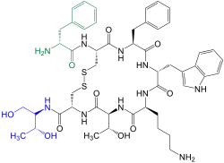 Oktreotid je syntetický analog somatostatinua, také známý jako sandostatin®. Poprvé byl syntetizována v roce 1982. Struktura oktopeptidu ukazuje, že aminokyselina threonin byla redukována na dusíkatý alkohol - threoninol.