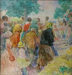 Ve volné tvorbě měla jeho díla mytické, historické a přírodní náměty.[7] Měl zájem o práci, život a radosti prostého lidu: s oblibou maloval shromáždění lidí na trzích, na poutích, procesích, polních pracích, v kostele i v hospodě. Jeho svérázná technika „rozplývavé tempery“[2] mu umožňovala nejen rychlý postup práce, odpovídající jeho temperamentu, ale dávala jeho obrazům nezvyklou měkkost obrysů postav a předmětů, navozovala dojem zvířeného prachu nebo chvějícího se teplého vzduchu, jako v oceňovaném obrazu Kováři.