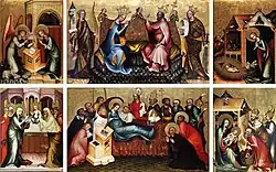 Otevřený oltář zobrazuje "vánoční" mariologický cyklus – horní střední část Korunování se sv. Barborou a sv.Kateřinou, dolní Smrt Panny Marie. Postranní výjevy zobrazují příchod Krista – Zvěstování, Narození, Klanění tří králů a Představení Krista v chrámu.