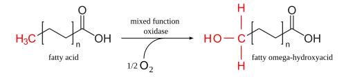 | Hydroxylace | oxidáza se smíšenou funkcí | V prvním kroku dochází k vložení hydroxylové skupiny na ω-uhlík. Kyslík v tomto hydroxylu pochází z molekulárního kyslíku a dostává se tam v složité reakci, jíž se účastní cytochrom P450 a NADPH. |
