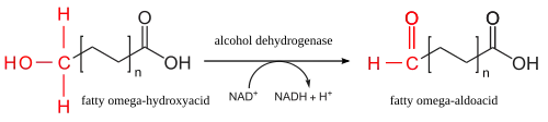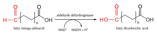 | oxidace | aldehyddehydrogenáza | V třetím kroku se karbonylová skupina oxiduje na karboxylovou skupinu (opět pomocí NAD+). Vzniká mastná kyselina s karboxylem na obou koncích. |