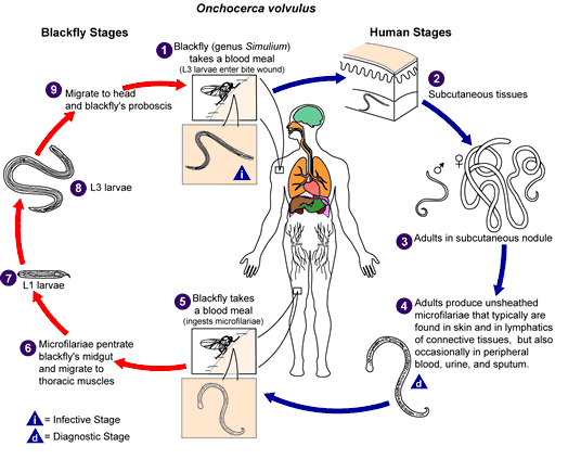 Infekce člověka hlísticí O. volvulus se nazývá onchocerkóza anebo říční slepota. Larvy se z krve dostávají do kůže hostitele (člověka) a tvoří tzv. onchocerkomy, což jsou uzlíky z vazivové tkáně tvořené převážně kolagenem a v těchto podkožních "boulích" dospívají. Většinou trvá poměrně dlouho, než se onemocnění vůbec projeví, larvy mohou dospívat i více než rok. Dospělí jedinci se po dozrání dále rozmnožují. Dospělec může žít v hostiteli 10-15 let a samičky neustále produkují další a další mikrofilárie.