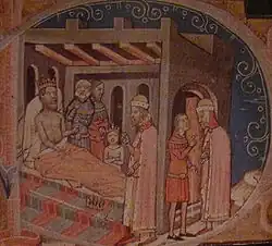 - ↑ Dle kronikáře jej velmi rozčílil zpěv během mše o podřízenosti jeho synů dětskému králi.[7]