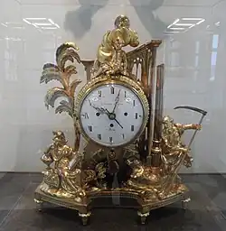 Praha, Uměleckoprůmyslové muzeum – schránka na hodiny se sedící postavou Minervy (kol. 1772), (dílna), stroj Sebastian Kürz, konzolové hodiny se Selene a Endymiónem? (asi 90. léta), (dílna), stroj Sebastian Kürz