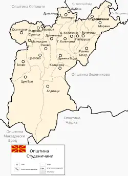 Opštinu tvoří celkem 22 vesnic, jimiž jsou: Studeničani, Aldinci, Batinci, Varvara, Vrtekiĉa, Gornji Koliĉani, Donji Količani, Draceviča, Dresnica, Elovo, Kaldirec, Ljubaš, Malčište, Markova Sušica, Morani, Osinčani, Pagarusa, Ramni Gaber, Umovo, Cvetovo, Crvena Voda, Crni Vrh.