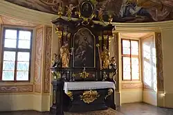 Skutečnost, že v kapli rezidence slavili benediktini bohoslužby, naznačují i dvě nevelké fresky v malovaných supraportách na chodbě patra se starozákonními náměty – Abrahám obětuje Izáka (Genesis 22, 1-14) a Setkání Abrahama s Melchisedechem (Genesis 14, 18-22) – předobrazy mešní liturgie. Uvnitř svatyně nade dveřmi je latinský nápis se jménem Bennona Löbla a chronogramem 1740.