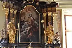 - svatý Benedikt – s opatskou berlou, s knihou Řehole, anděl nese pohár s hadem (jed v nápoji),